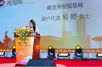 御龙服装城商户代表易婷女士则从合作伙伴的角度,分享了与御龙共同成长、并肩奋斗的温馨故事,道出了广大商户的心声。